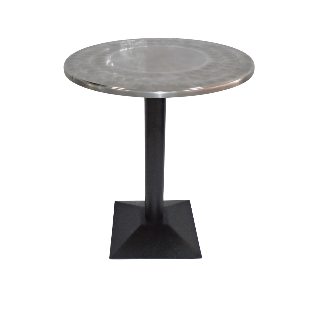 Base estructura metálica pintada en negro de 36x36 y peso de 8kg con tapa en madera redonda forrada en acero