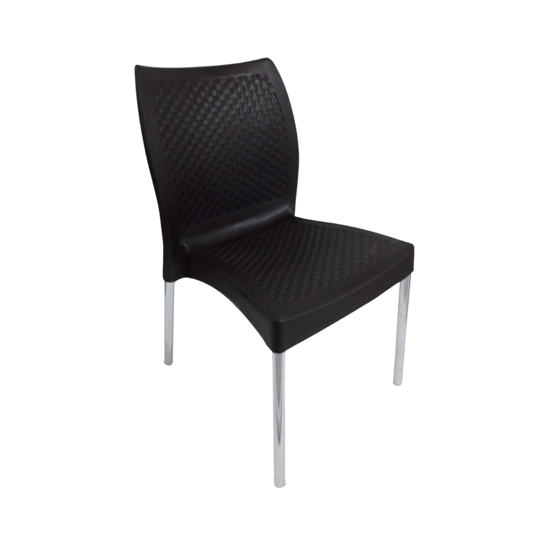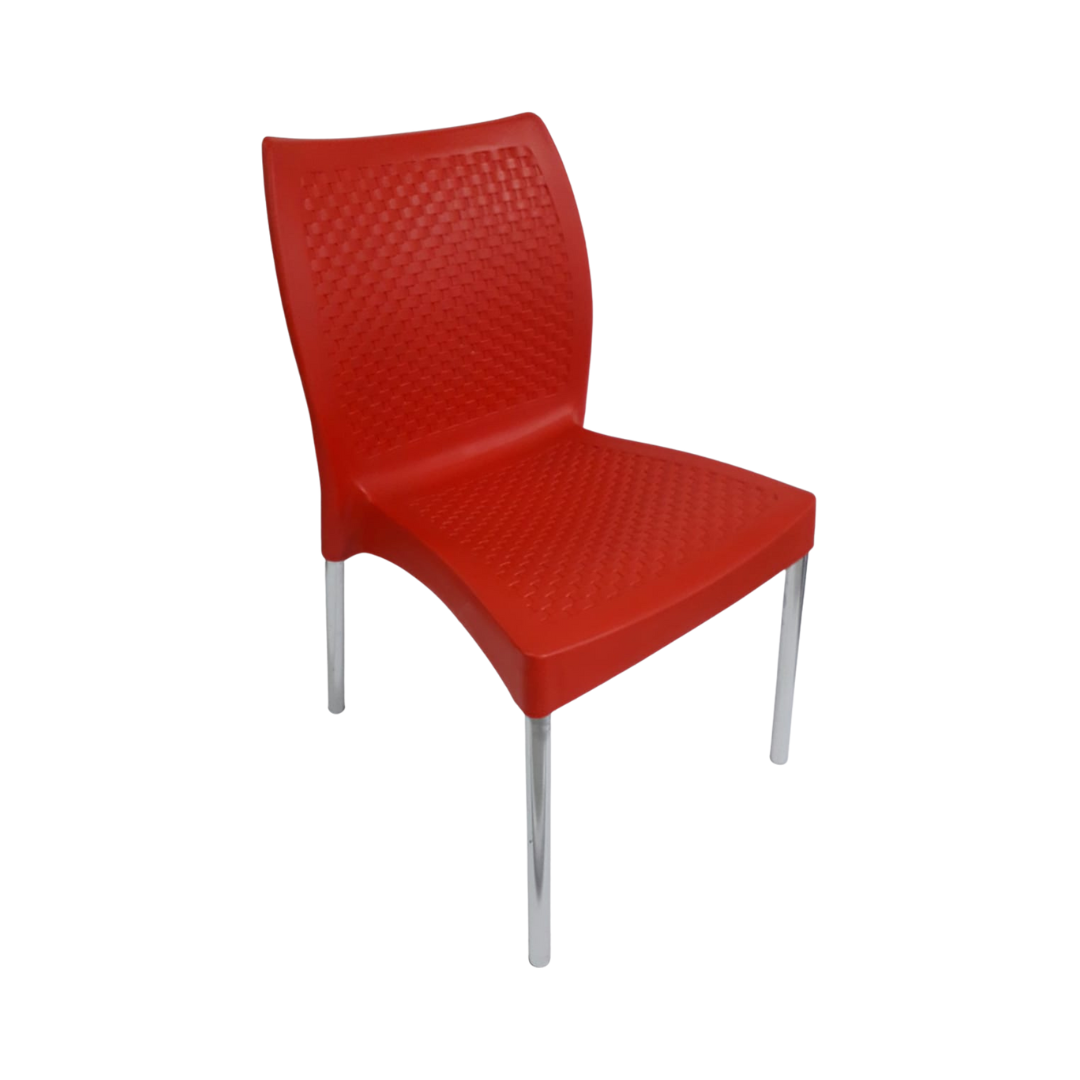 Sentadero y espaldar elaborado en polipropileno con pata metálica, ideal para interiores y exteriores, apilable y protegida contra rayos UV