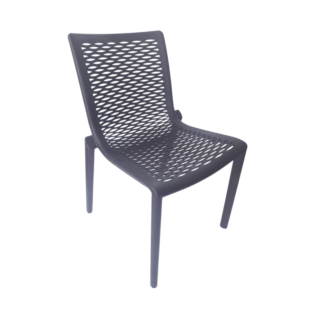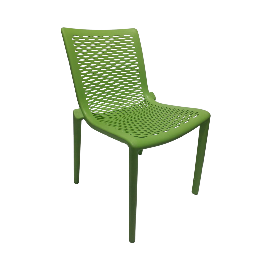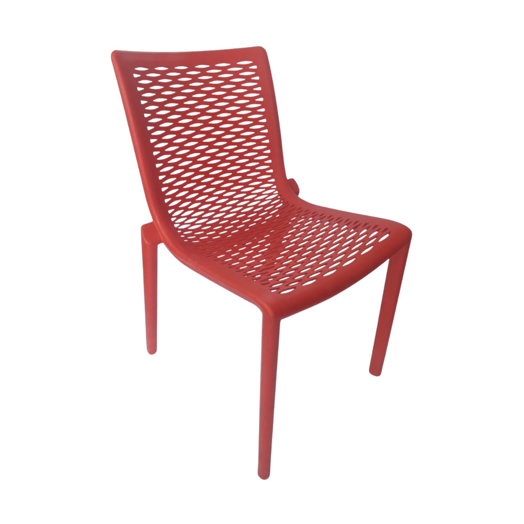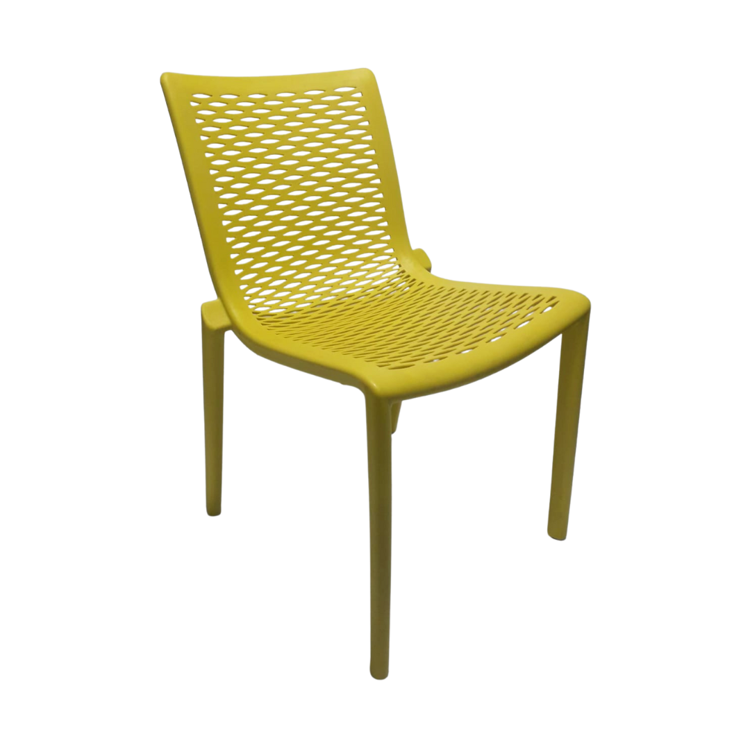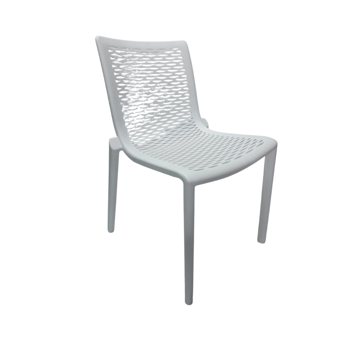 Silla elaborada en polipropileno y fibra de vidrio, ideal para interiores y exteriores, apilable y protegida contra rayos UV