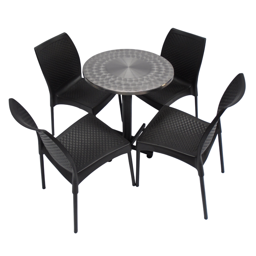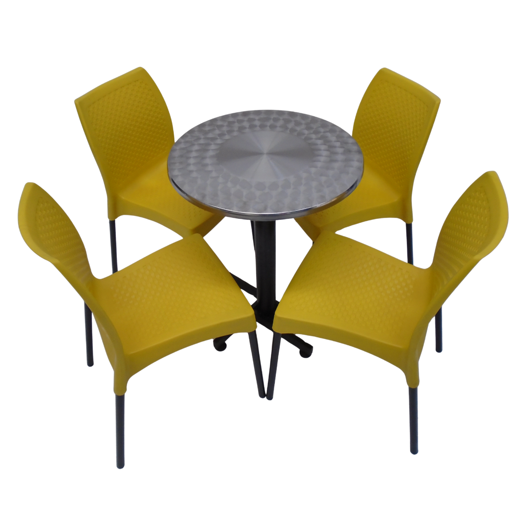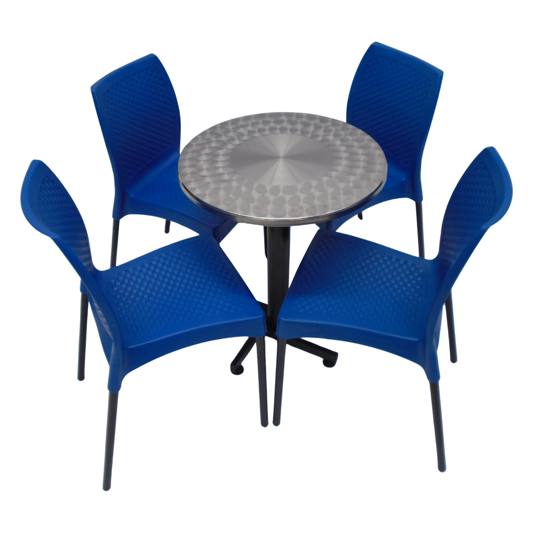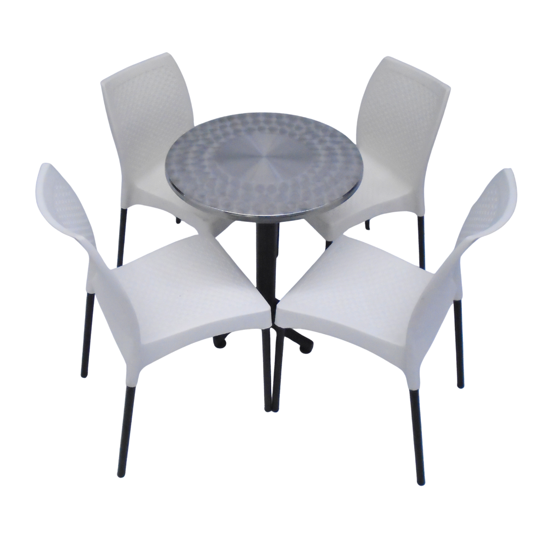 4 Sillas Diseño sin brazo elaboradas en polipropileno con pata metálica y mesa base H con tapa en madera de 90x60