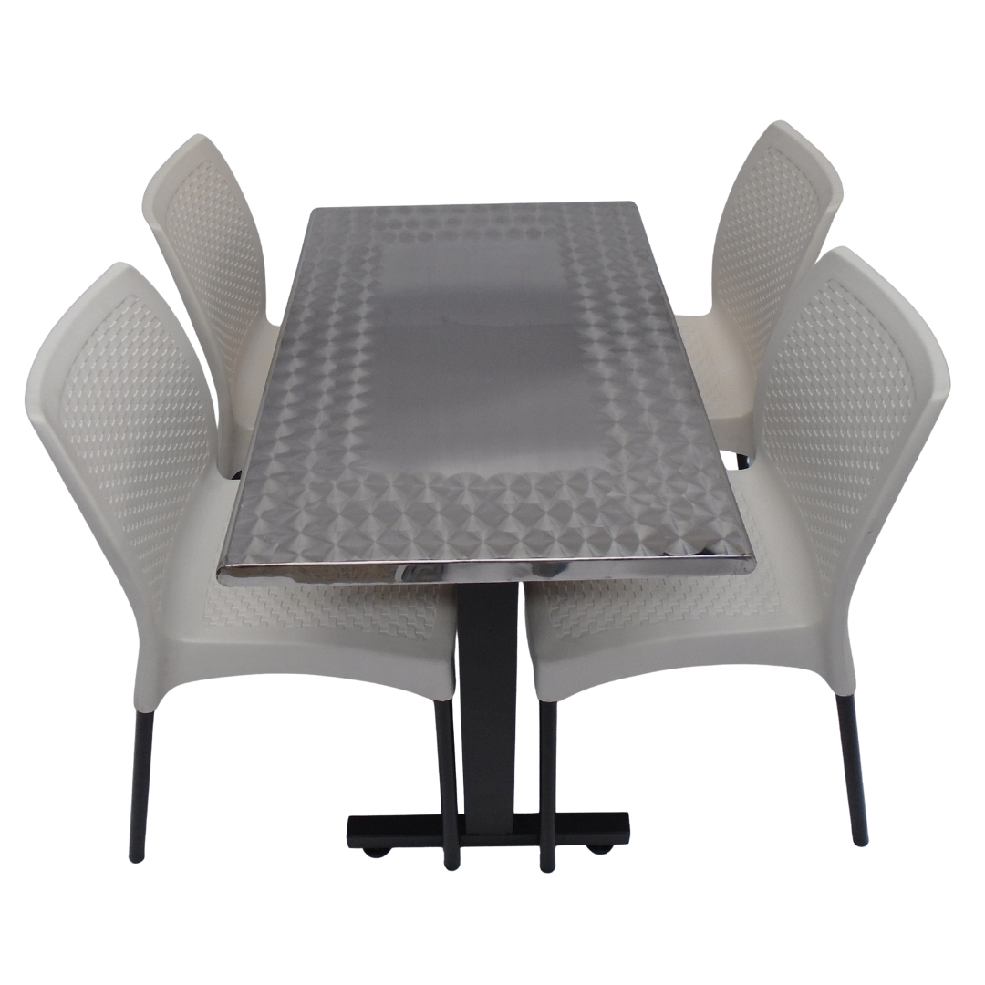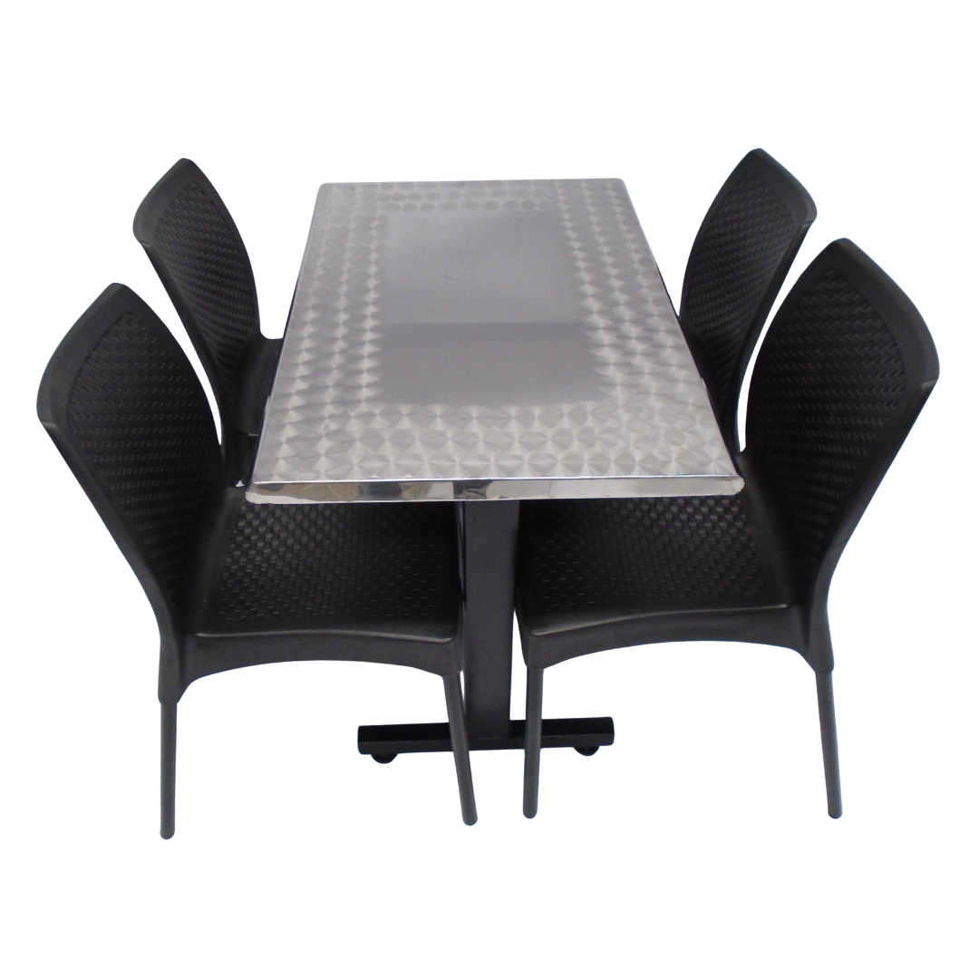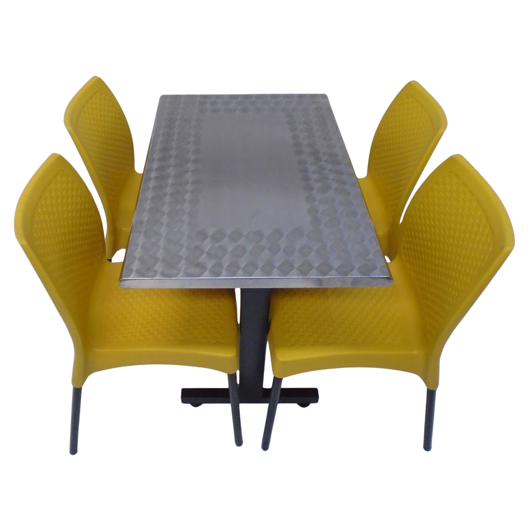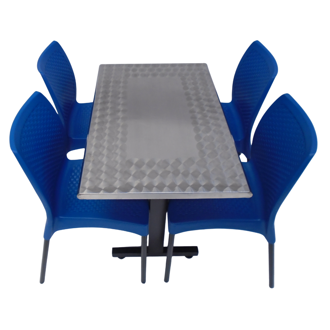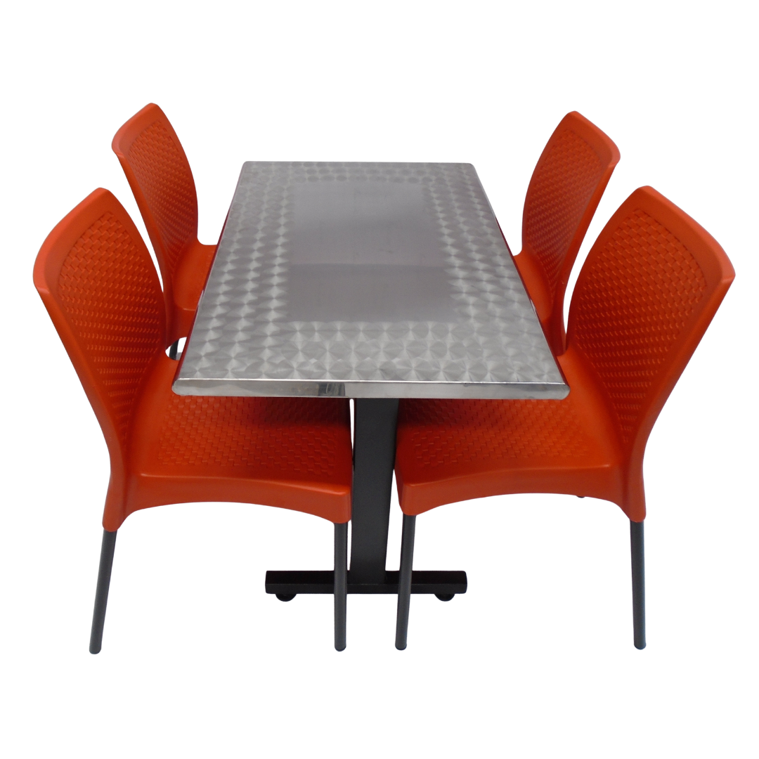 4 Sillas Diseño sin brazo elaboradas en polipropileno con pata metálica y mesa base H con tapa en madera forrada en acero de 90x60