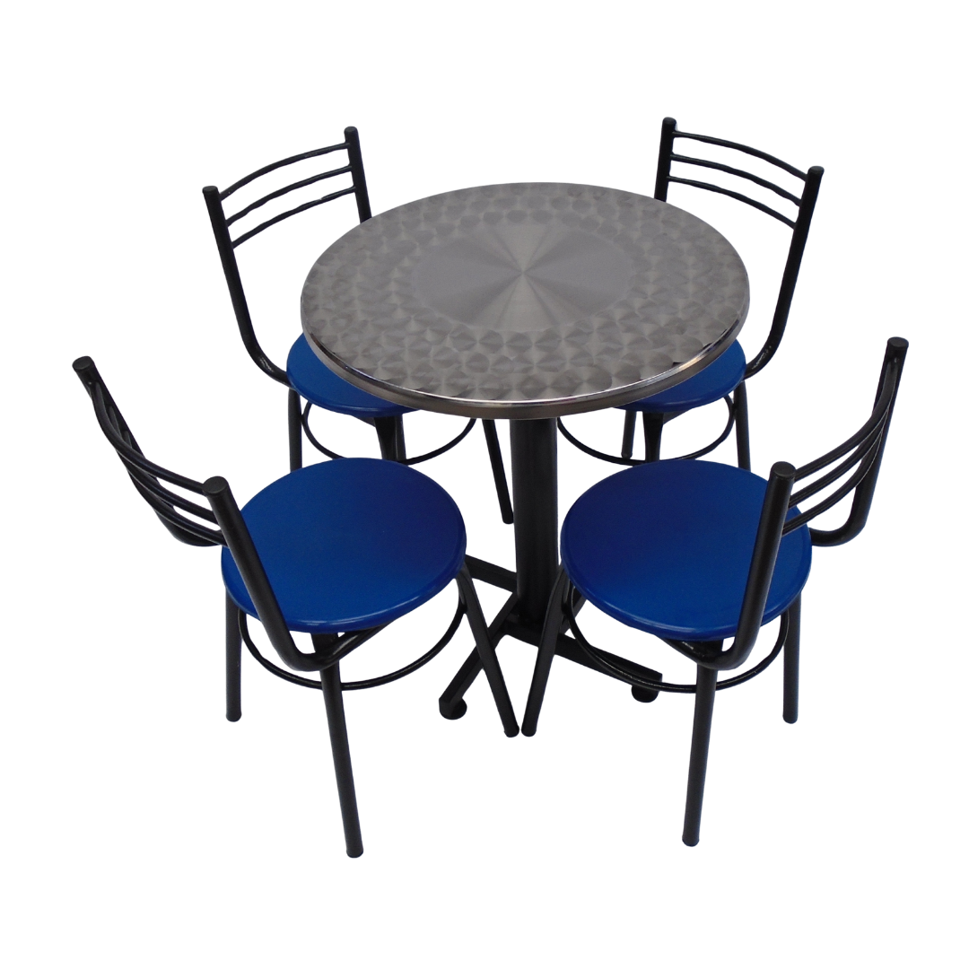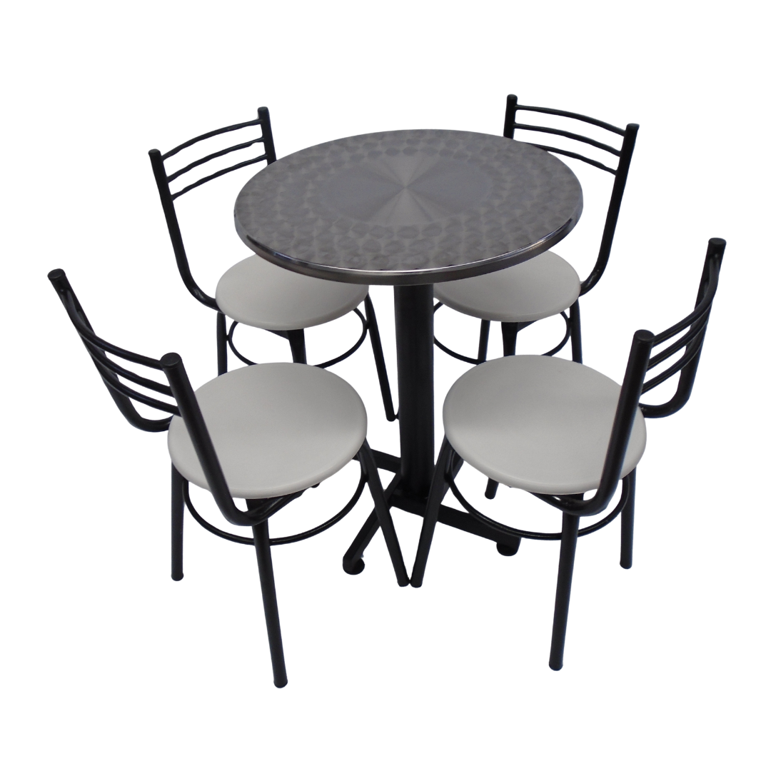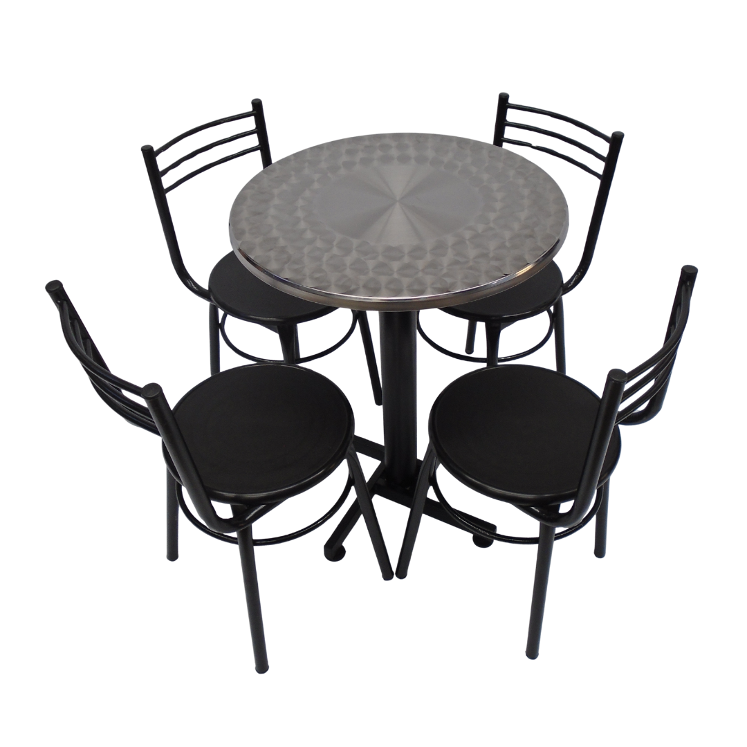 4 Sillas España con estructura metálica, sentadero plastico y mesa base cruceta con tapa redonda de 60CM en madera forrada en acero