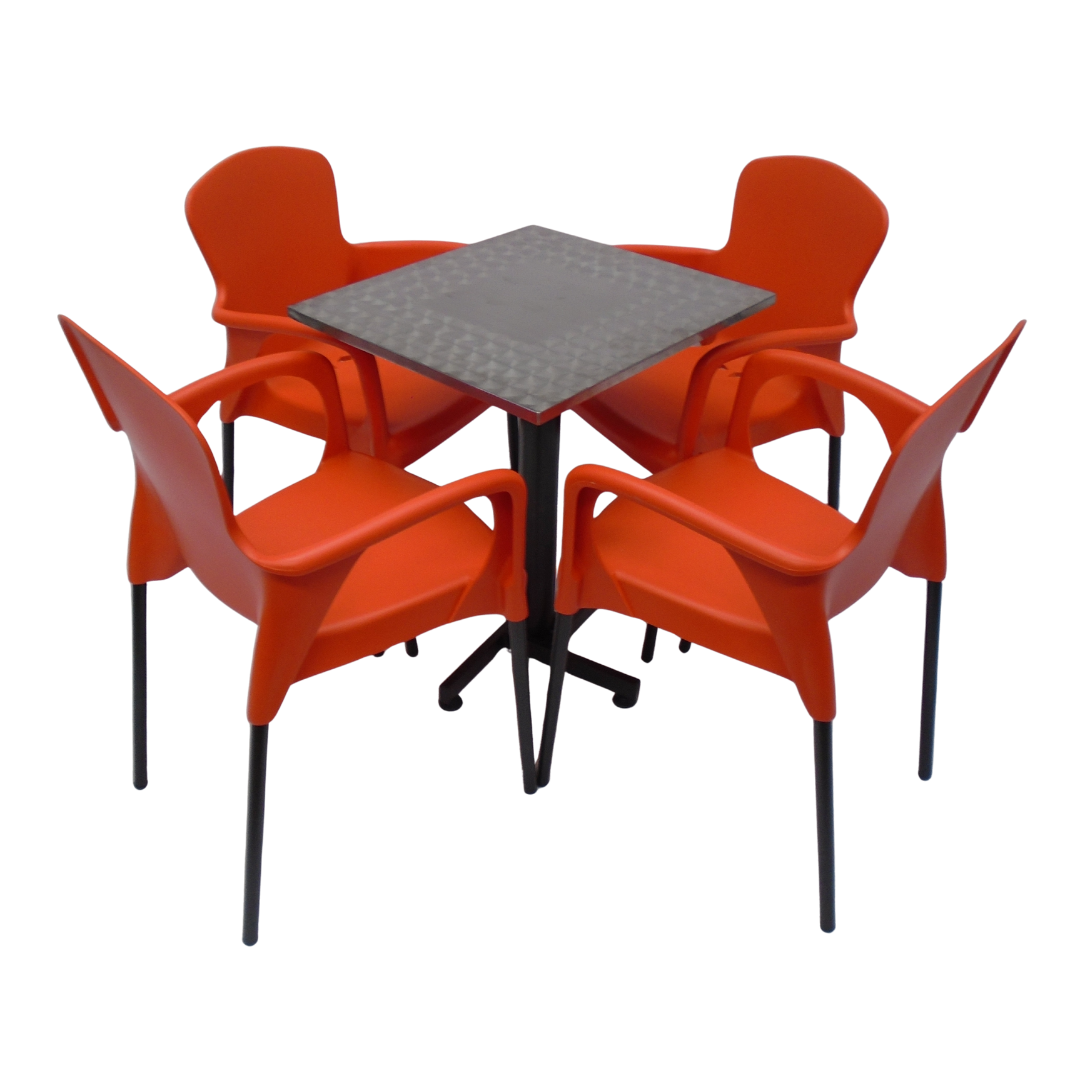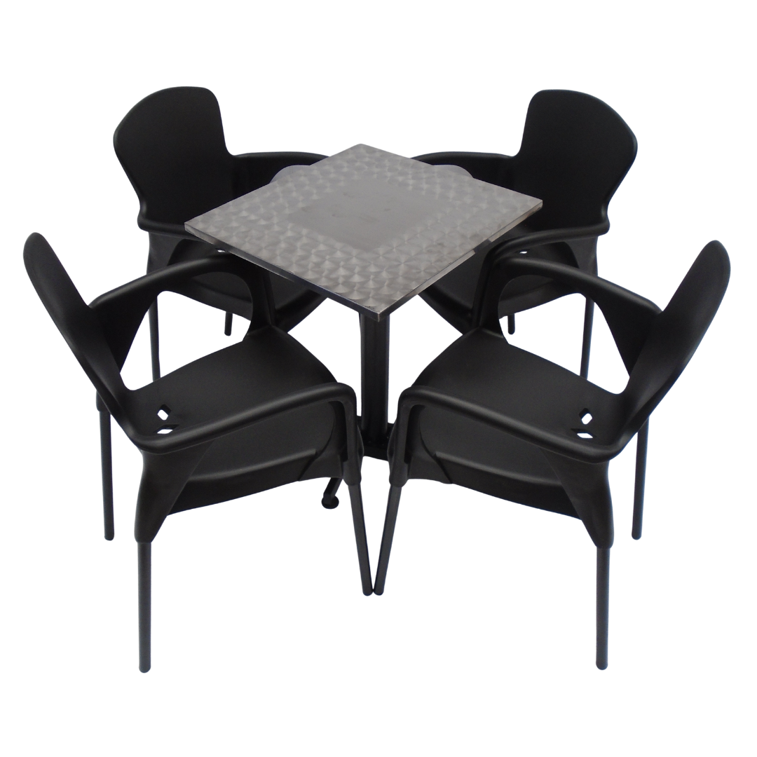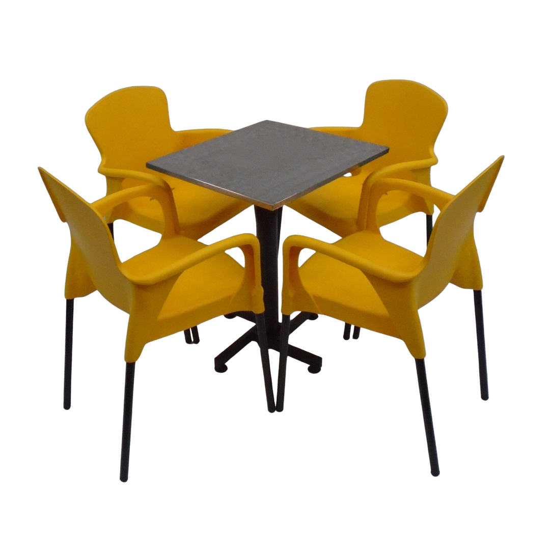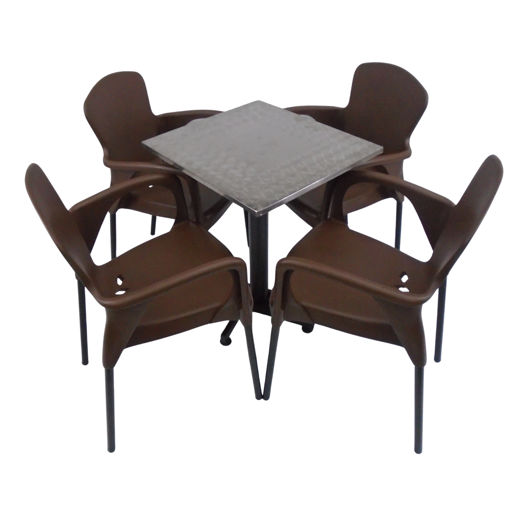 4 Sillas Eva con brazo elaboradas en polipropileno con pata metálica y mesa base cruceta con tapa en madera forrada en acero de 60x55