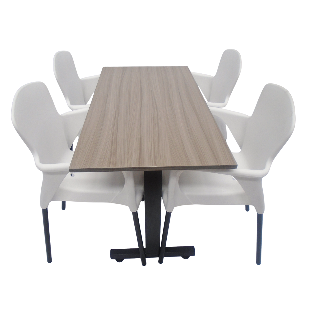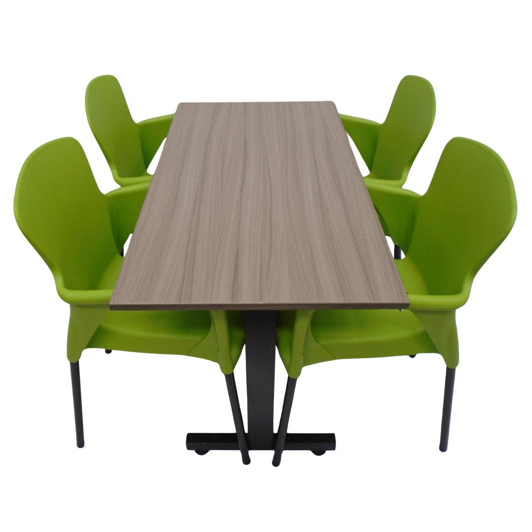 4 Sillas Eva con brazo elaboradas en polipropileno con pata metálica y mesa base H especial en madera de 120x60