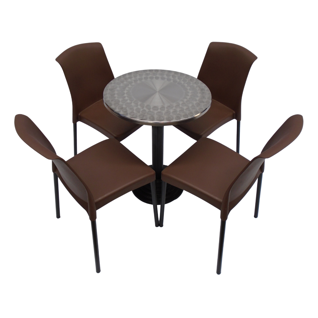 4 Sillas Eva sin brazo elaboradas en polipropileno con pata metálica y mesa base disco tapa redonda de 60CM en madera forrada en acero