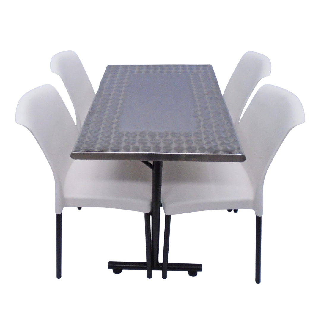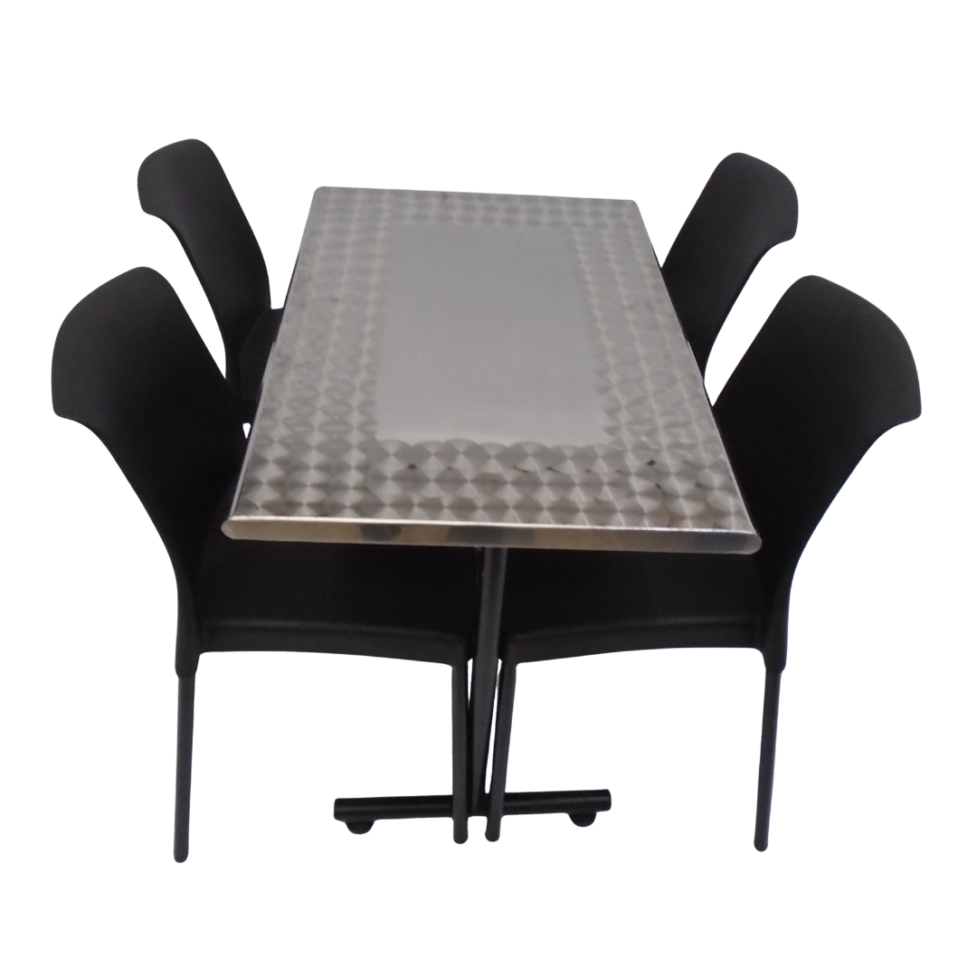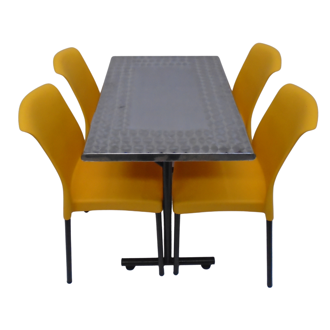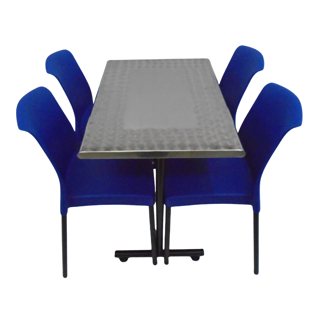 4 Sillas Eva sin brazo elaboradas en polipropileno con pata metálica y mesa base H con tapa en madera forrada en acero de 90x60