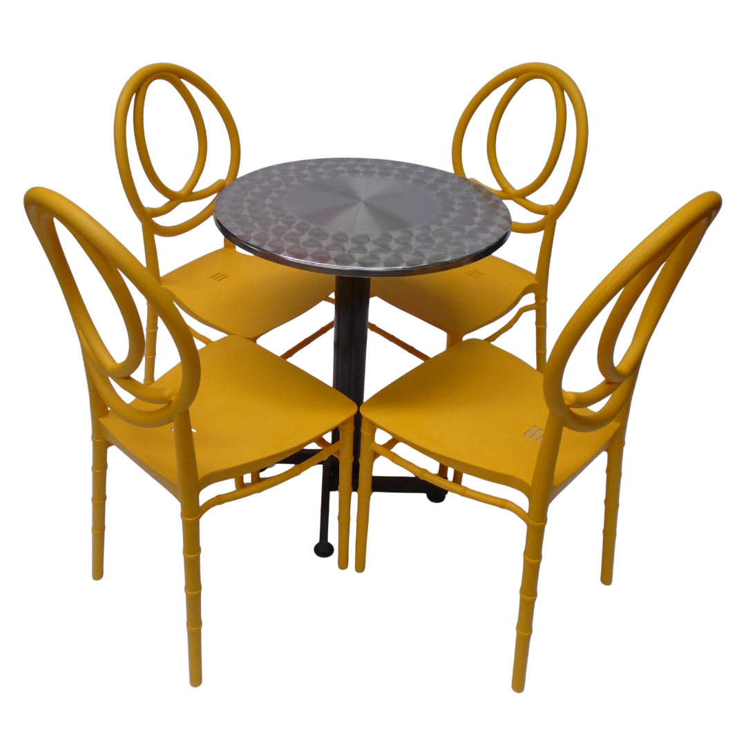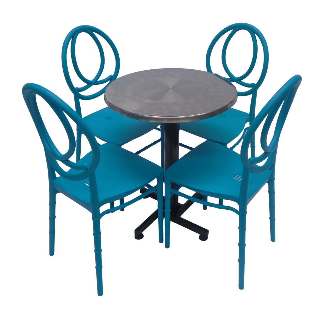 4 Sillas Tifany elaboradas en polipropileno con mesa base cruceta tapa redonda de 60CM forrada en acero