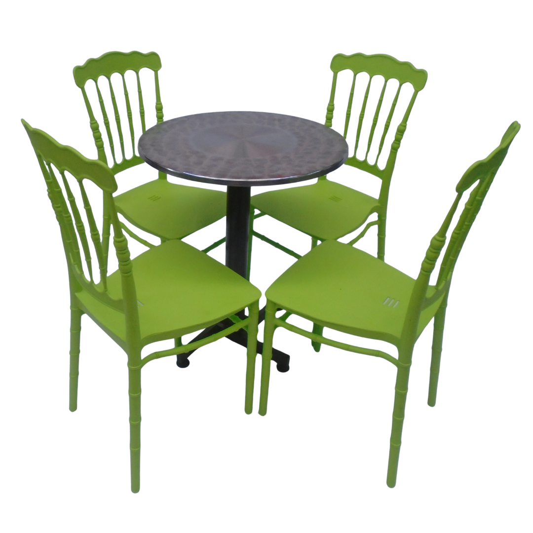 4 Sillas Tifany elaboradas en polipropileno con mesa base cruceta tapa redonda de 60CM forrada en acero