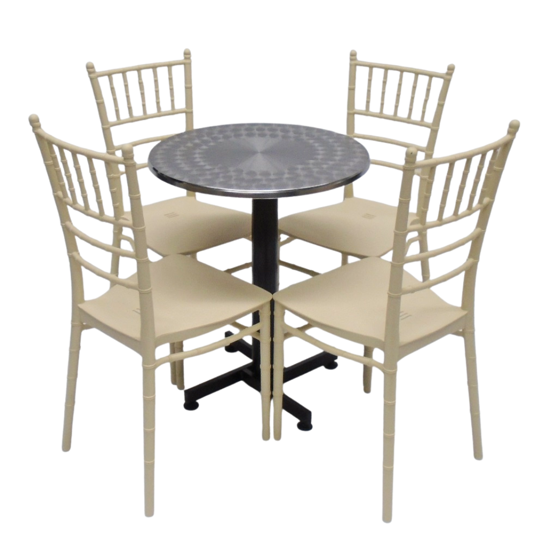 Sillas Tifany E5 con mesa base cruceta redonda tapa en acero de 60CM